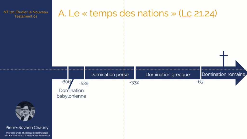 Or, Ezéchiel 30, qui emploie ce langage du « temps des nations » prophétise l’invasion par Nabuchodonosor de l’Egypte. Cet événement marque le début d’une période où un grand empire domine de l’oued d’Egypte à l’Euphrate (l’aire d’influence idéale des rois davidiques). Les Babyloniens, les Perses et les Mèdes, les Grecs et finalement les Romains domineront désormais dans ces contrées.Au terme (ou à l’accomplissement) de ce temps des nations, nous dit Jésus en prophétisant la première guerre juive qui conduit à la destruction du temple, Jérusalem sera foulée aux pieds par les nations coalisées dans l’Empire romain.